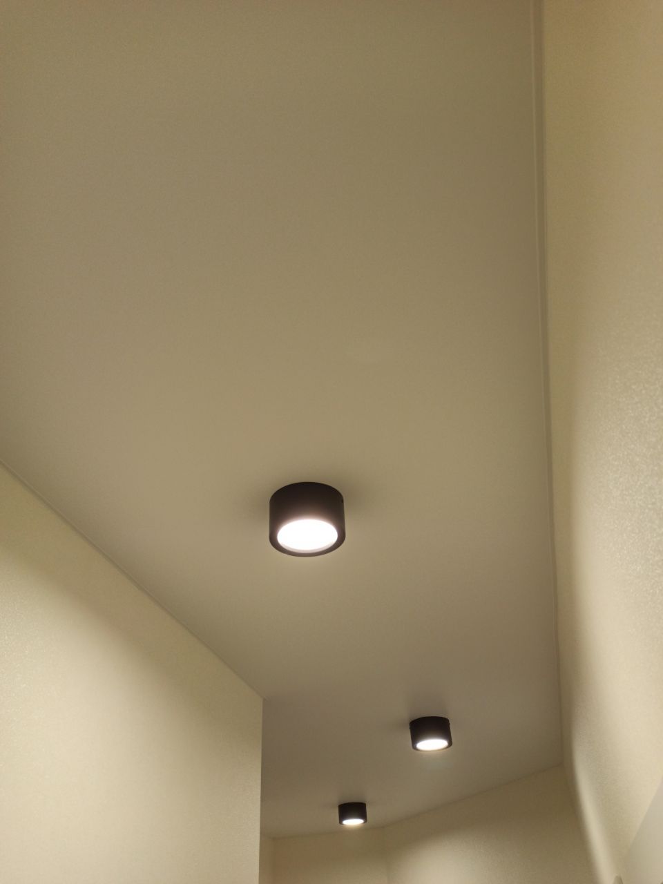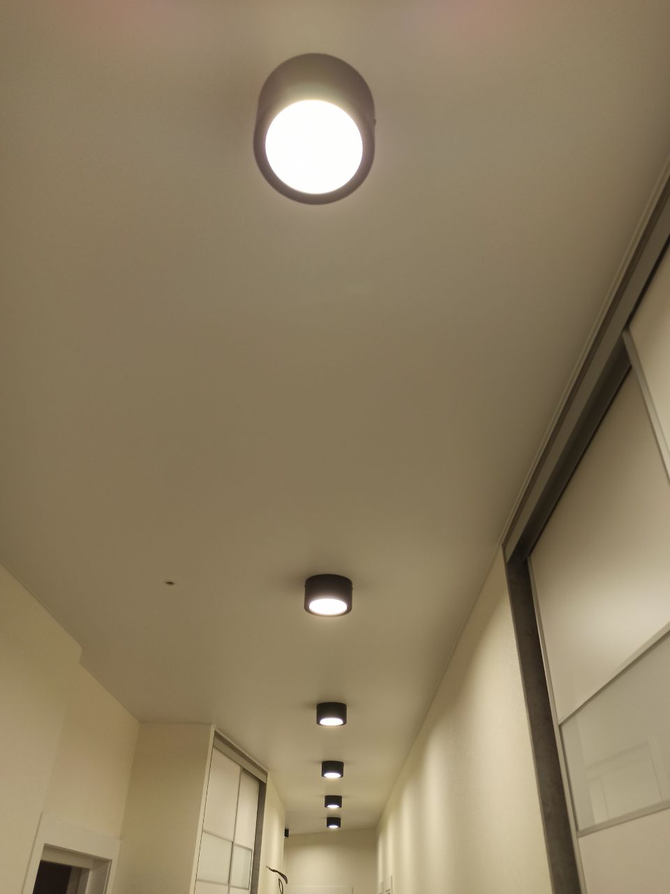 Белый матовый потолок в прихожей со светильниками