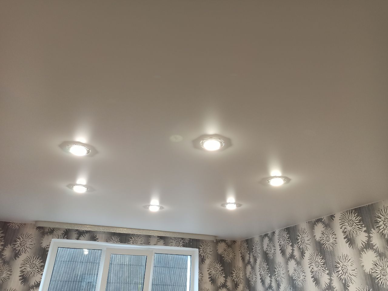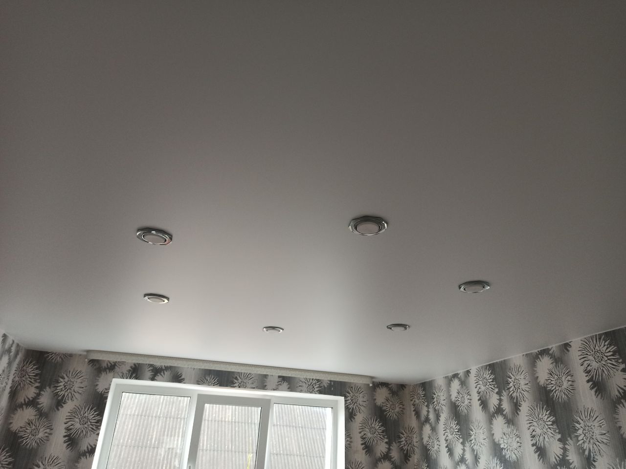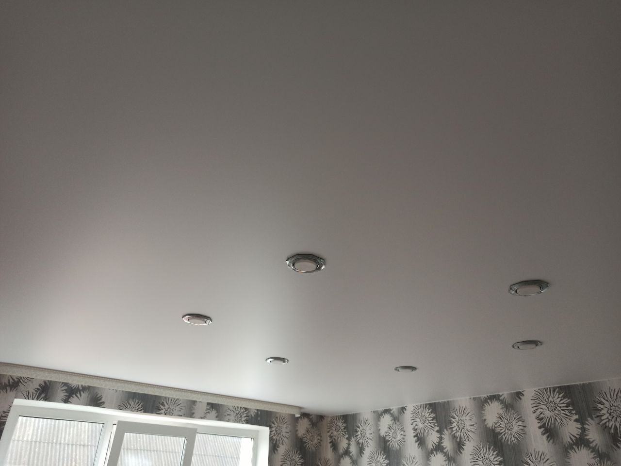 Белый сатиновый натяжной потолок в зале с шестью светильниками.