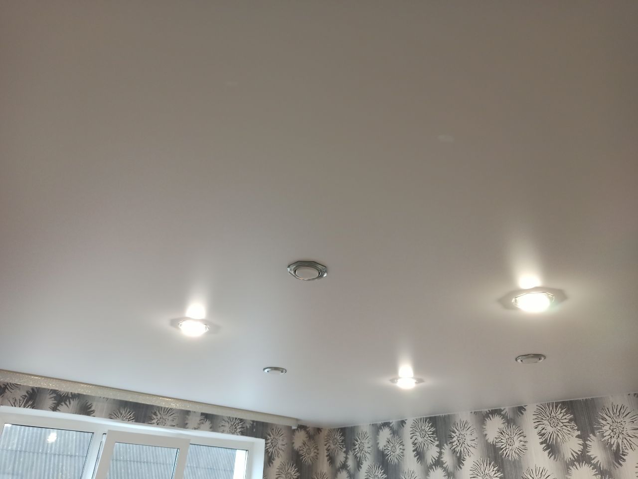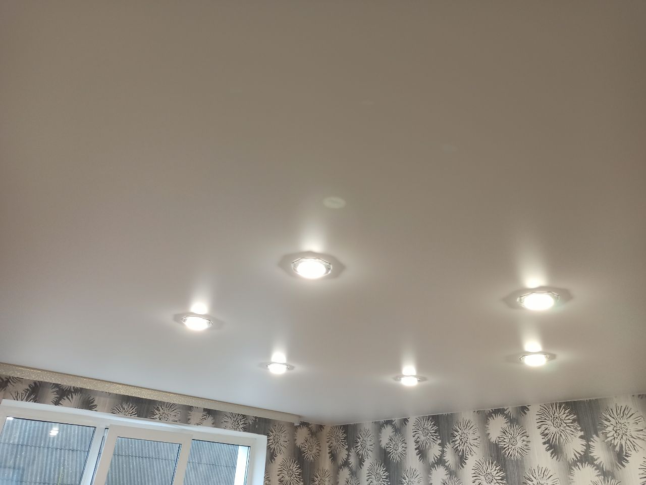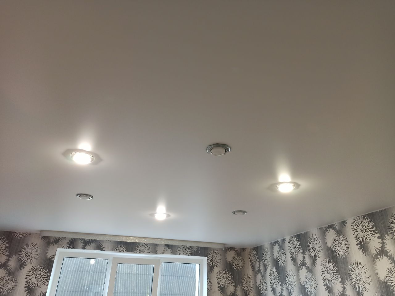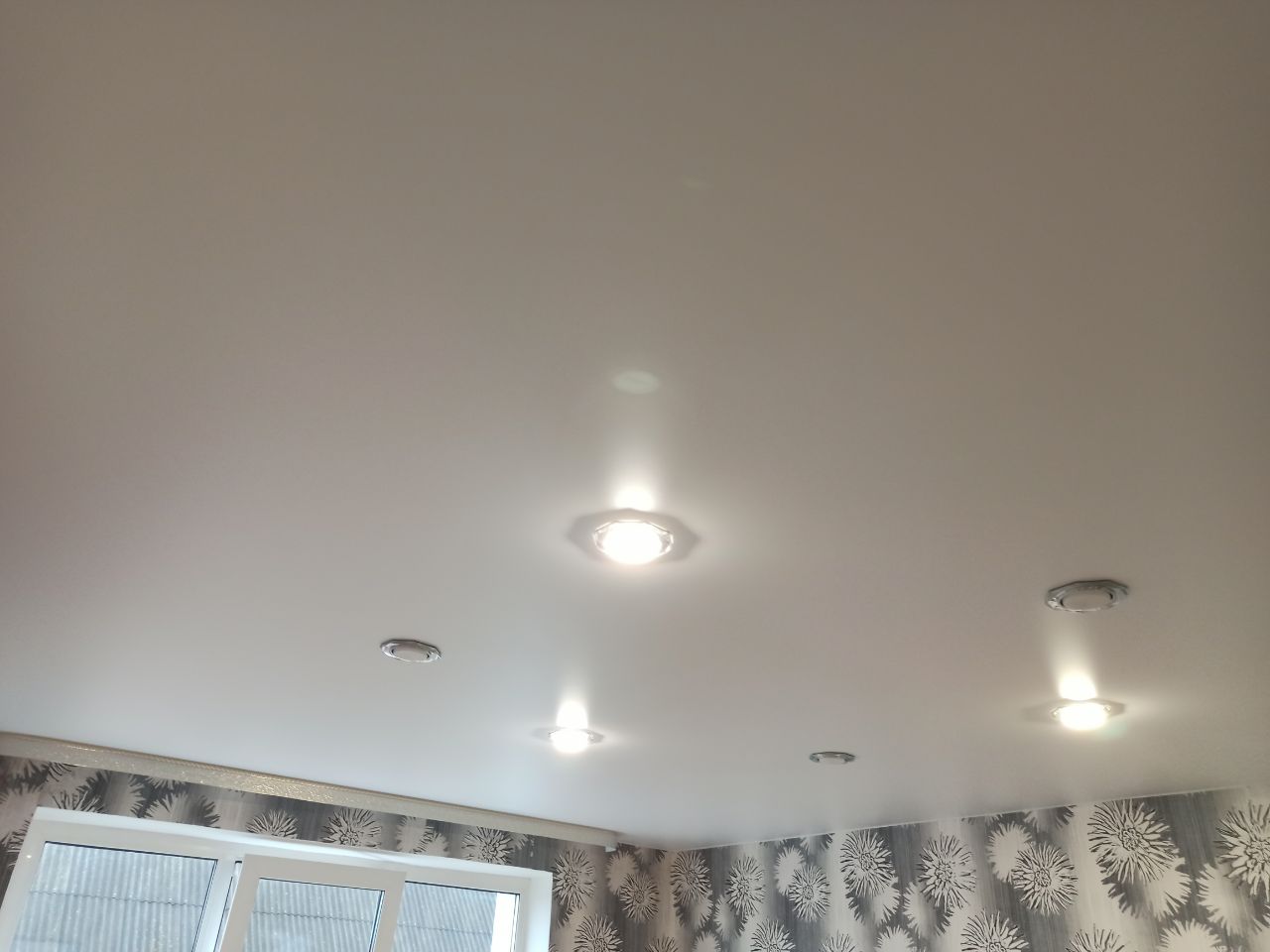 Белый сатиновый натяжной потолок в зале с шестью светильниками.