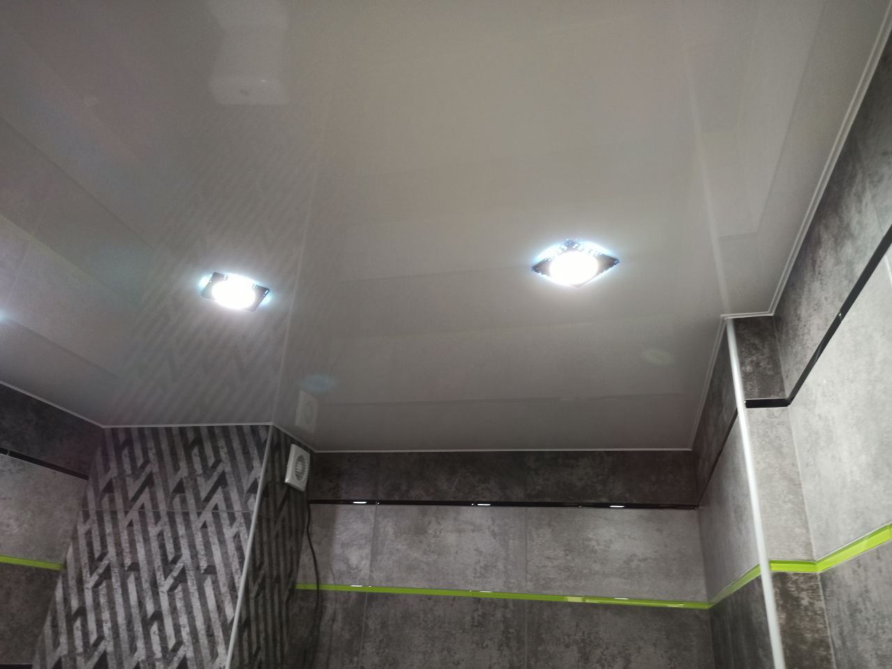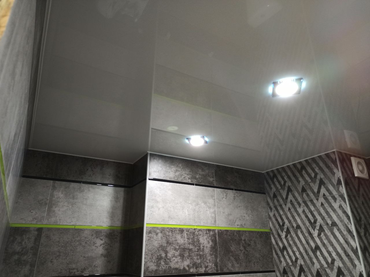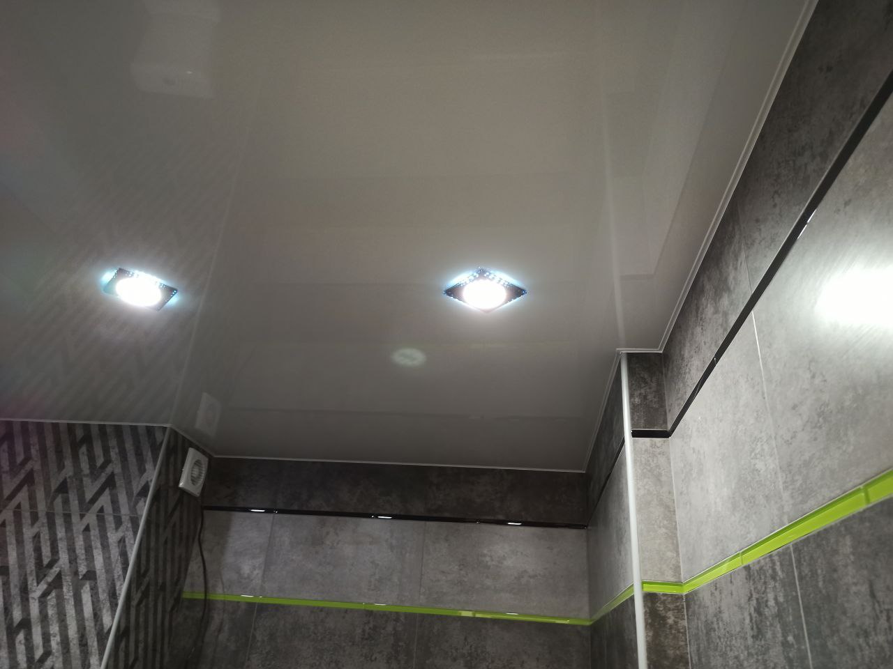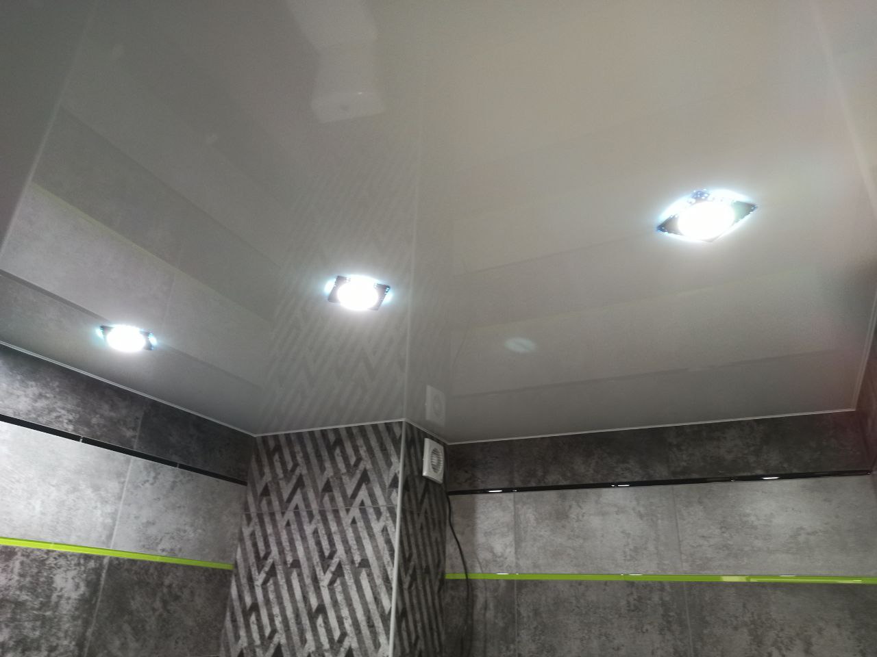 Глянцевый потолок в ванной.