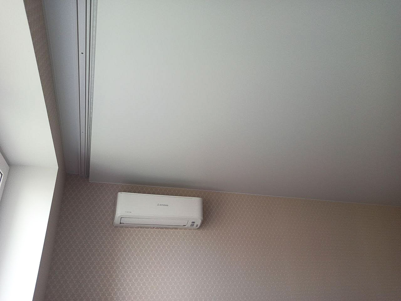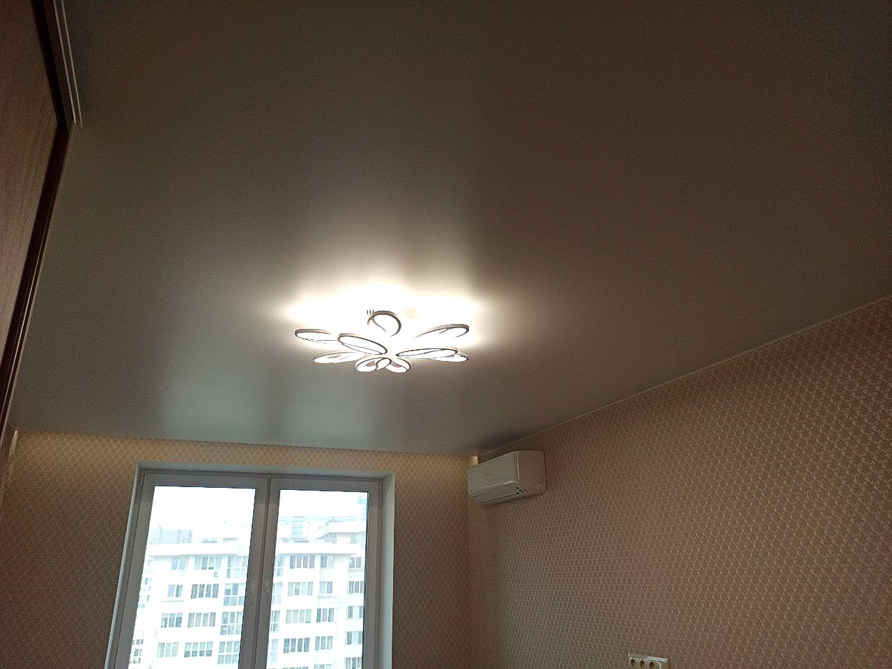 Сатиновый потолок в спальне с люстрой.